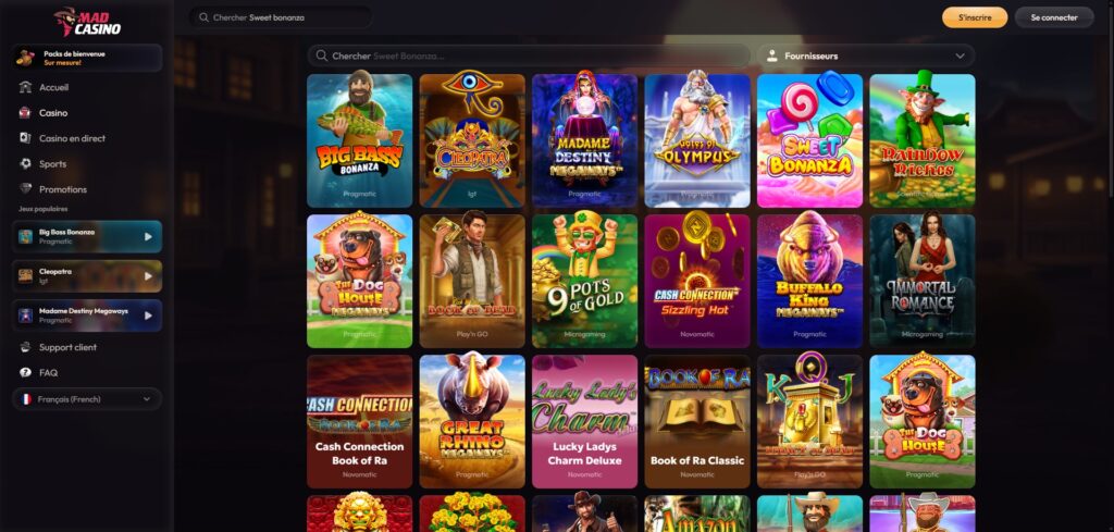 Avec plus de deux mille titres à explorer, la ludothèque de Mad Casino s’adresse aussi bien aux adeptes de machines à sous qu’aux passionnés de jeux traditionnels. Cette diversité permet d’éviter toute lassitude et de répondre aux envies du moment, que ce soit une session rapide ou une longue soirée immersive. La sélection de jeux couvre tous les goûts et garantit un divertissement renouvelé à chaque visite.